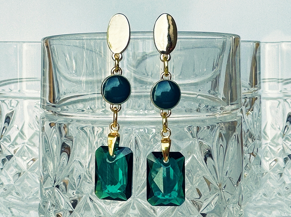 Jako základ pro většinu náušnic jsme si vzali Emerald Cut přívěsky Swarovski, protože jejich obdélníkový stupňovitý výbrus zvaný emerald, neboli smaragdový, byl v klenotnickém řemesle používán jako jeden z prvních. Jak název napovídá, tento brus je velmi oblíbený u smaragdů, tudíž evokuje velký luxus.
