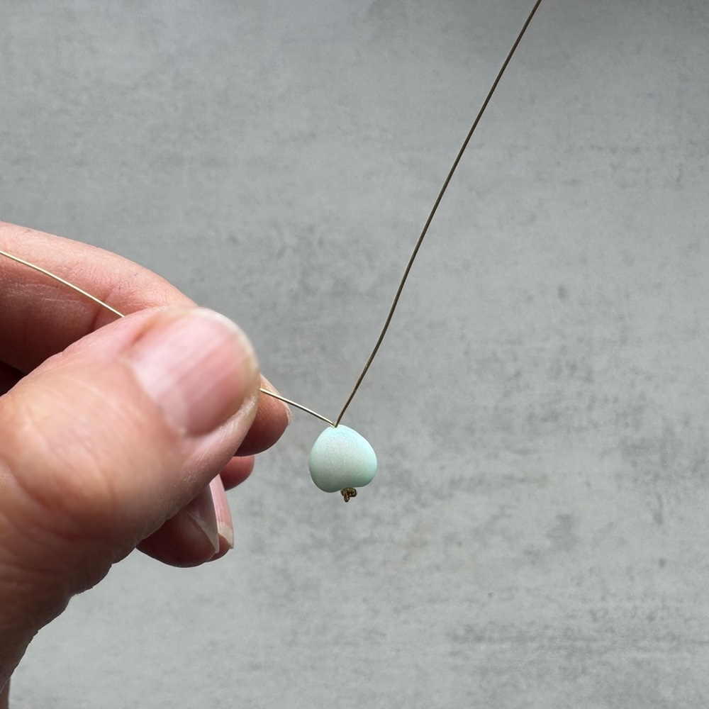 3. Oba konce drátu provlékněte srdíčkem, prdelkou napřed. Srdíčko dotáhněte až ke korálku.