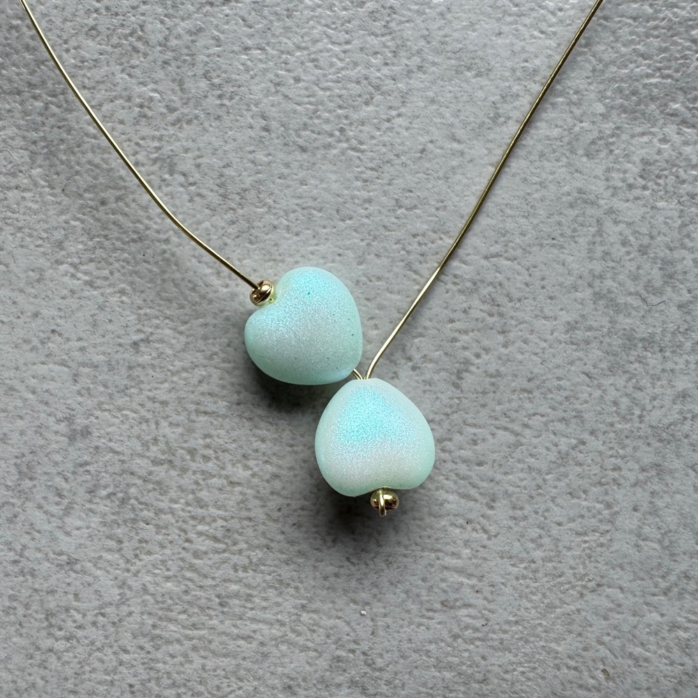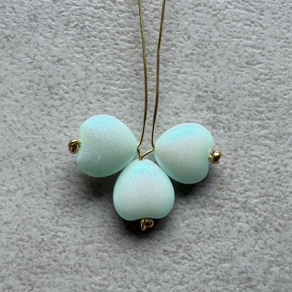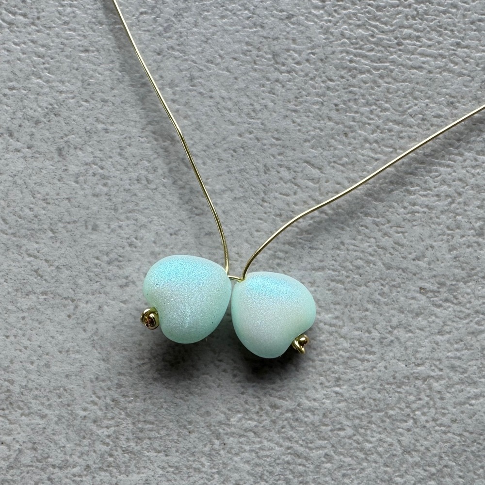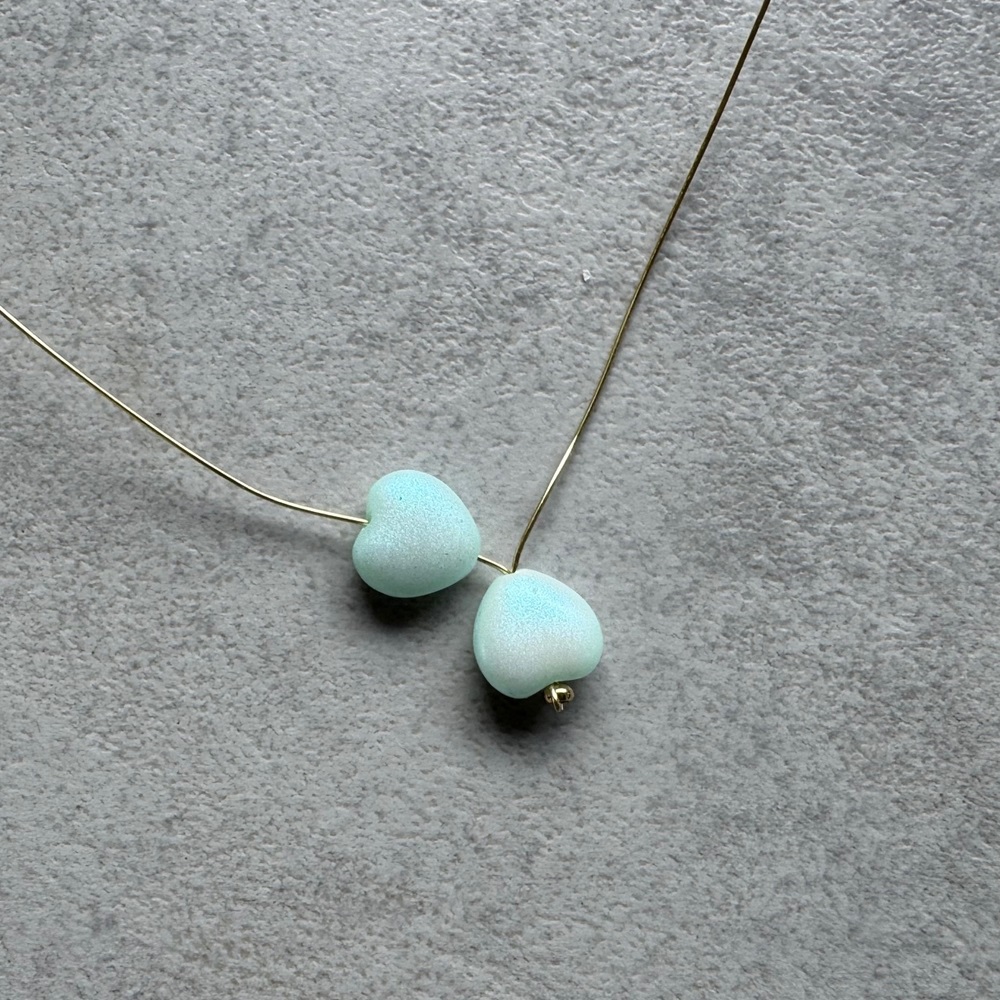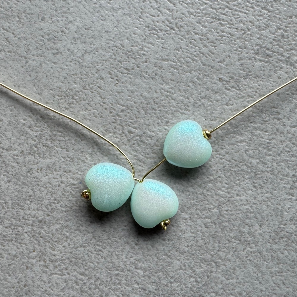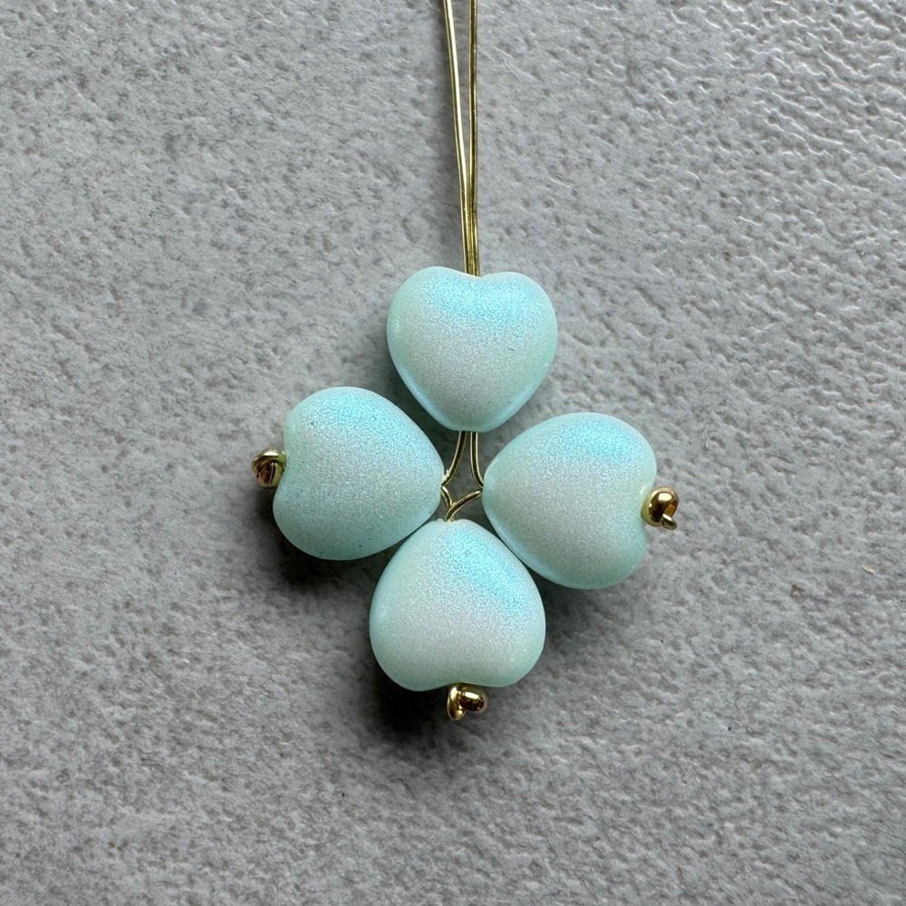4. Drátky rozdělte, na jeden navlékněte srdíčko od špičky, pak ocelový korálek a vraťte se srdíčkem zpět (ocelový korálek vynechte). Utáhněte tak, aby špičky srdíček byly u sebe.