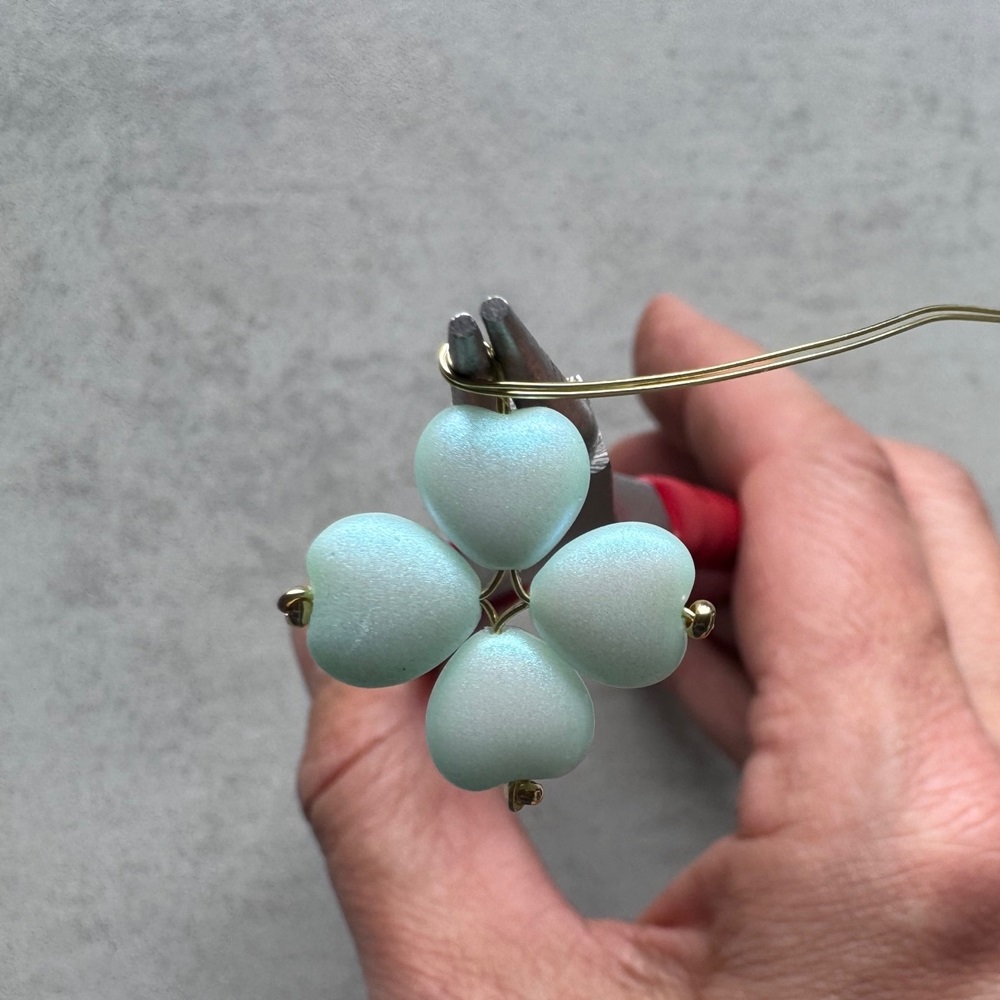 6. Oba drátky provlékněte čtvrtým srdíčkem od špičky. Drátky asi 2mm za srdíčkem ohněte do pravého úhlu a chyťte oba kulatými kleštičkami. Vytvořte očko a konce drátu omotejte dvakrát pod očkem. Snažte se omotáním celý čtyřlístek jakoby utáhnout, nenechávejte mezi očkem a srdíčkem neomotaný drátek.