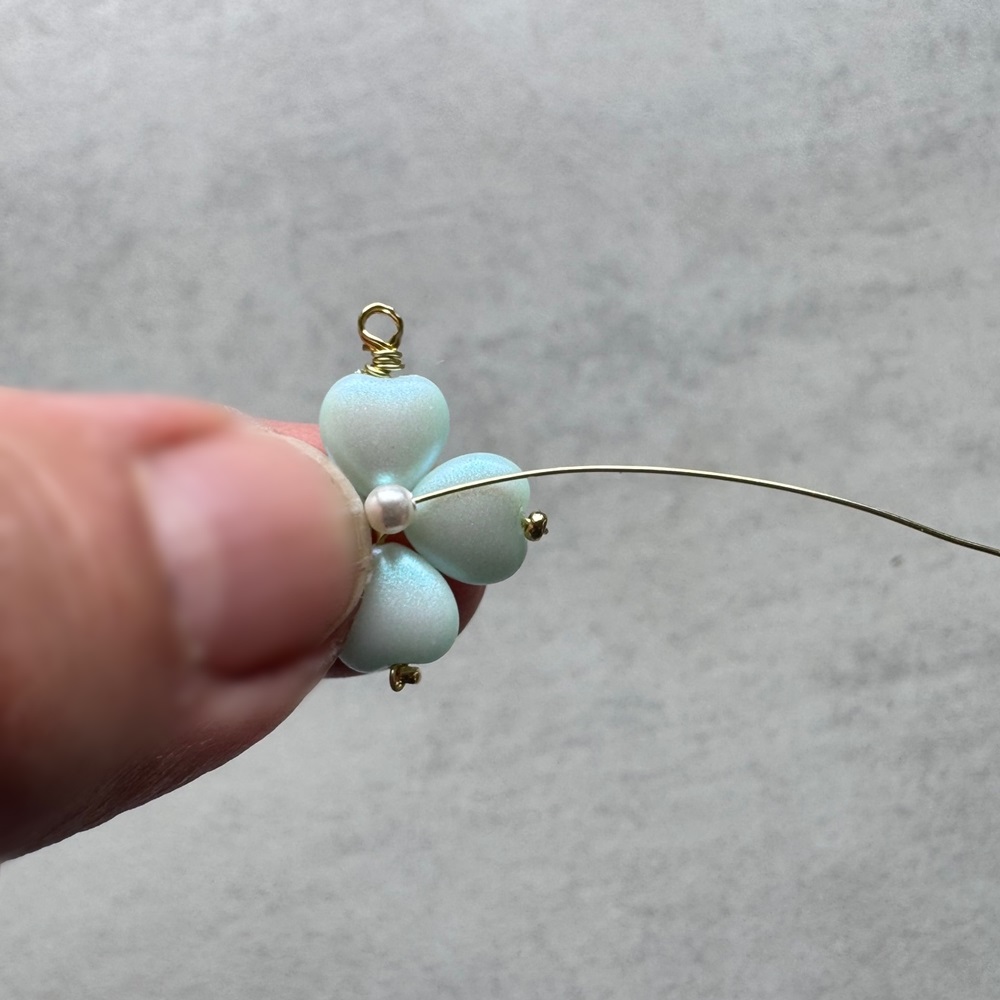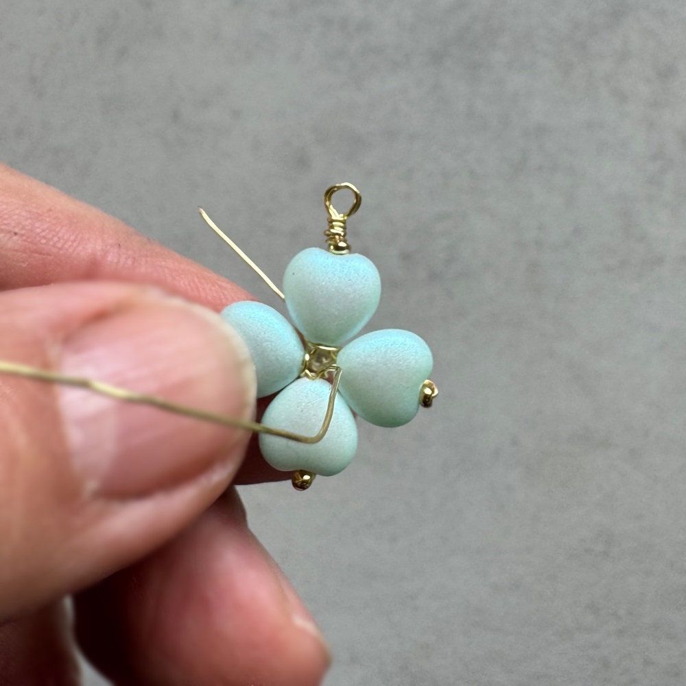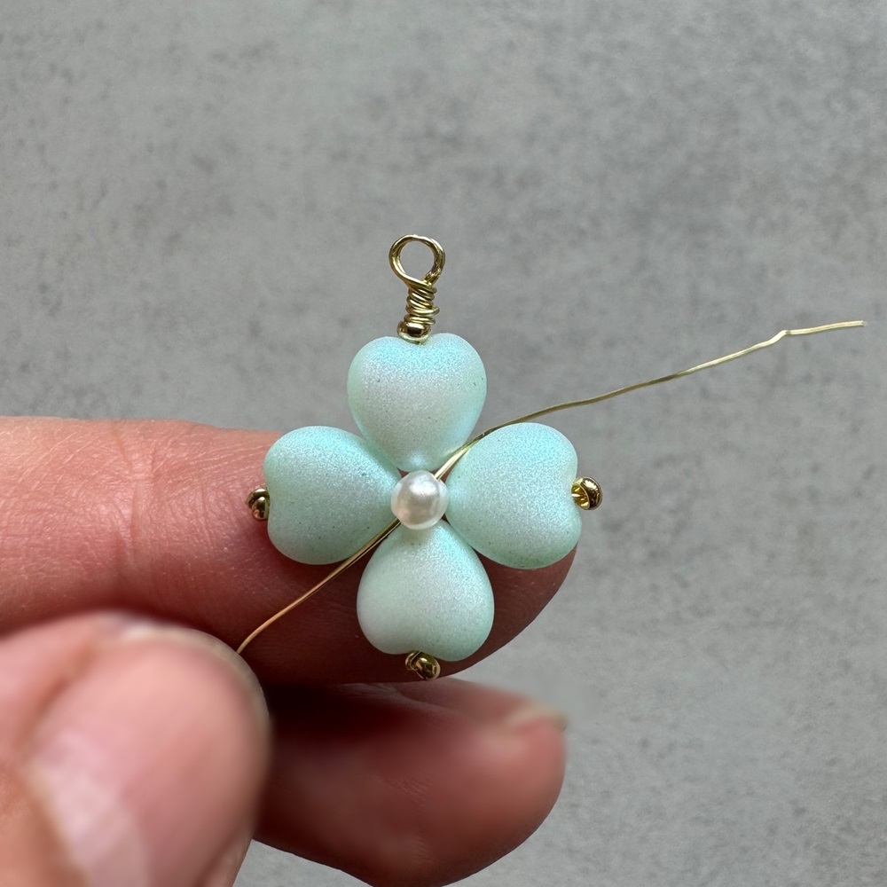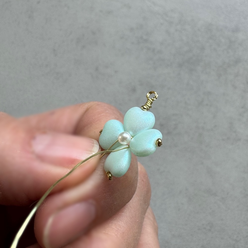 Na jeden drátek navlékněte perličku a stejně jako v předešlých třech krocích obtočte drátky kolem špiček srdíček zepředu dozadu. Stačí jednou pak drátek ustřihněte a špičku přimačkněte, aby nevyčuhovala ze čtyřlístku nikde ven.