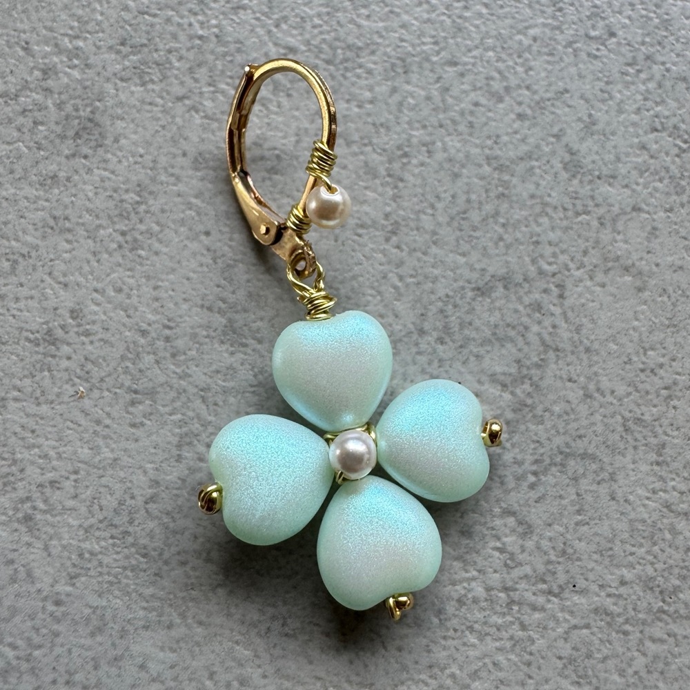 Čtyřlístky pověste na náušnicový háček nebo zapínání. Zapínání můžete ozdobit přidrátováním perličky, aby se čtyřlístkem ladilo. Náušničky jsou pak něžnější.