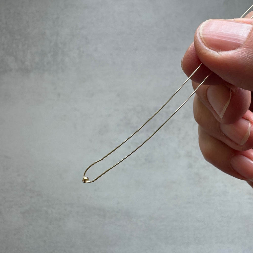 Na ustřižený drát navlékněte jeden kovový zlatý korálek, umístěte ho do středu drátu a ten ohněte na polovinu.